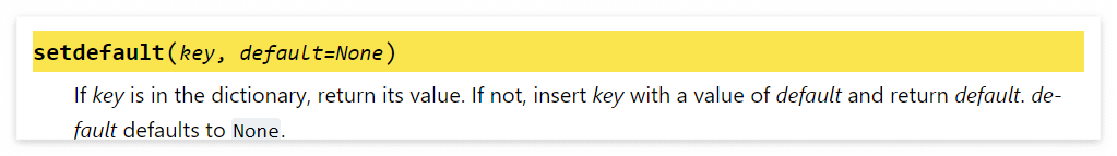 key가 딕셔너리에 있다면, 그것의 value(값)을 돌려줍니다. 그렇지 않으면, default를 값으로 갖는 key를 삽입하고, default(None, 또는 새로 설정하면 그 값)를 return합니다. 이때 default를 새로 설정하지 않는다면, None입니다.